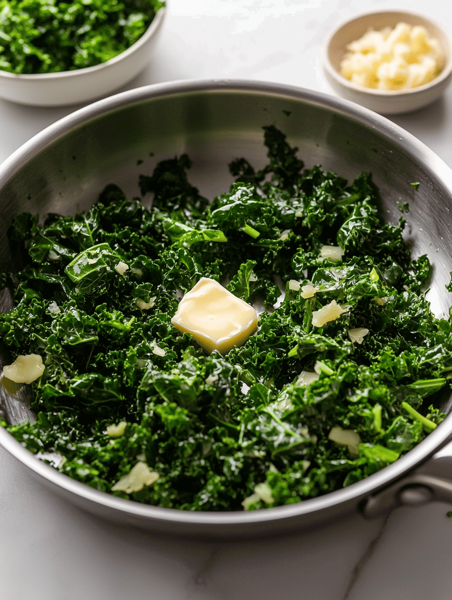 • While the potatoes cook, warm a sauté pan over medium heat. Add a tablespoon of butter and sauté the chopped greens with a pinch of salt until they wilt and become tender, about 5-7 minutes. Add minced garlic and cook for another minute until fragrant and just starting to brown.