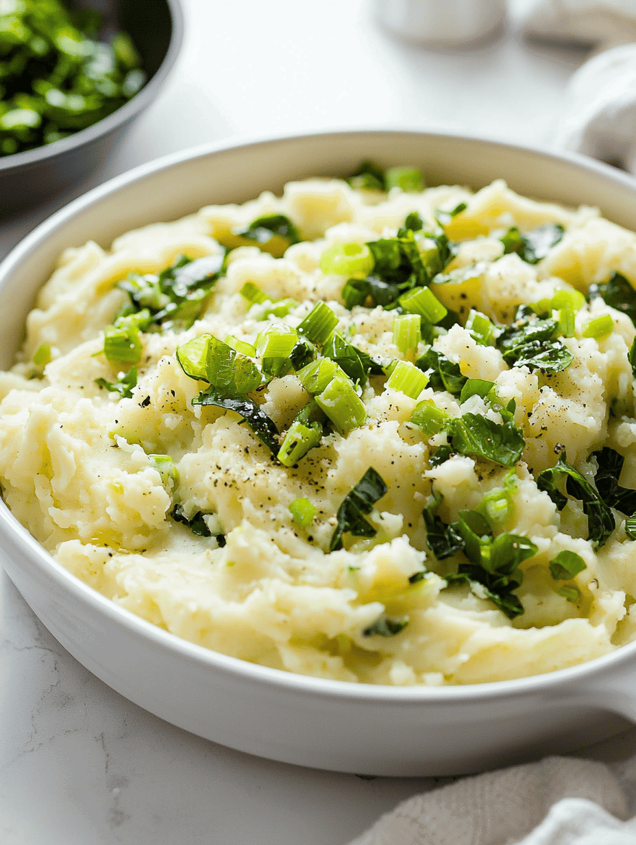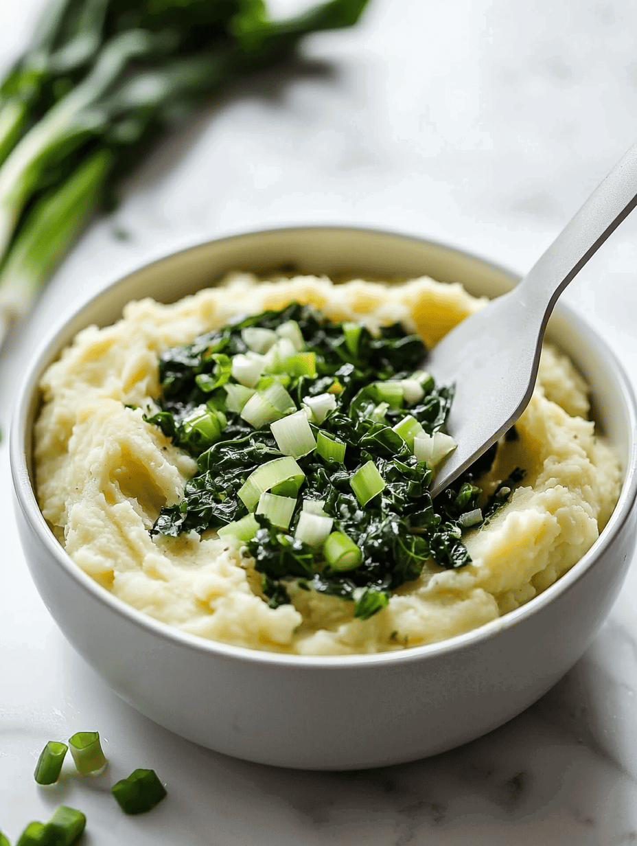 Colcannon is a traditional Irish side dish made with smooth, mashed potatoes mixed with sautéed greens and scallions. It features a creamy texture with crispy-tender greens, often enhanced with butter and flavorful herbs. The dish is visually inviting, with a velvety base topped with bright, slightly crispy greens.