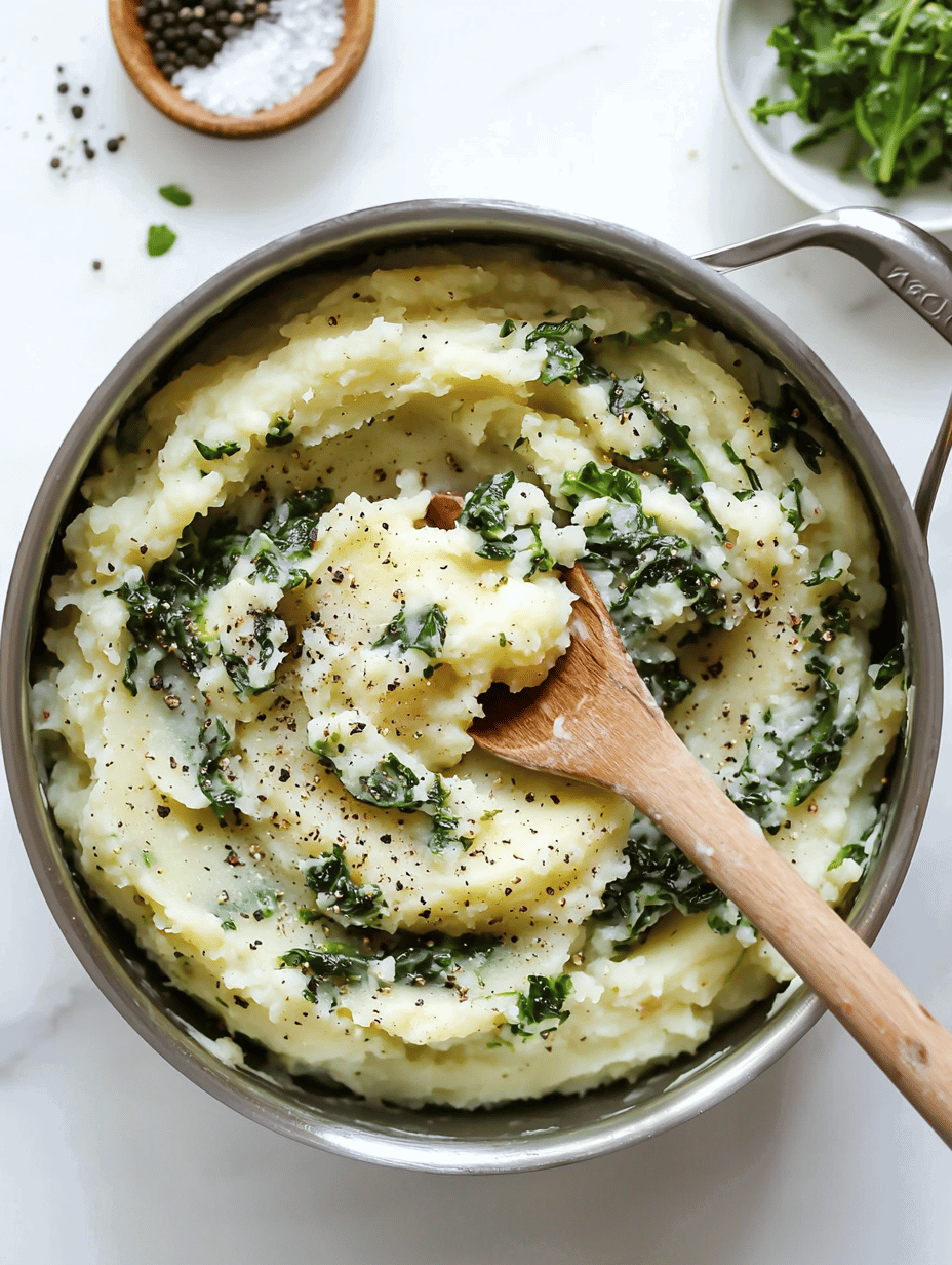 • Add the sautéed greens and scallions to the mashed potatoes, folding gently to combine and distribute the greens evenly throughout the mash.