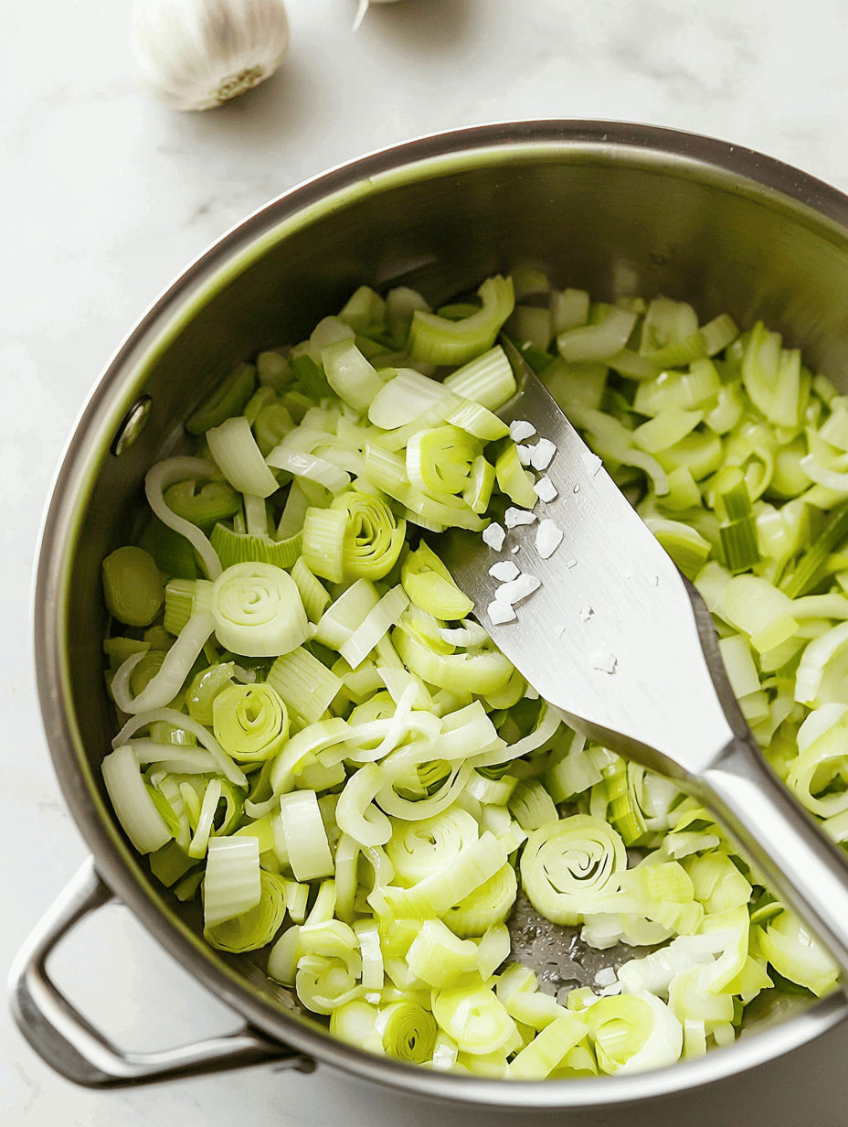- Heat the remaining tablespoon of olive oil in a large pot over medium heat. Add the chopped leeks and a pinch of salt, then cook gently for about 8-10 minutes until they soften and start to turn translucent, releasing a sweet aroma.