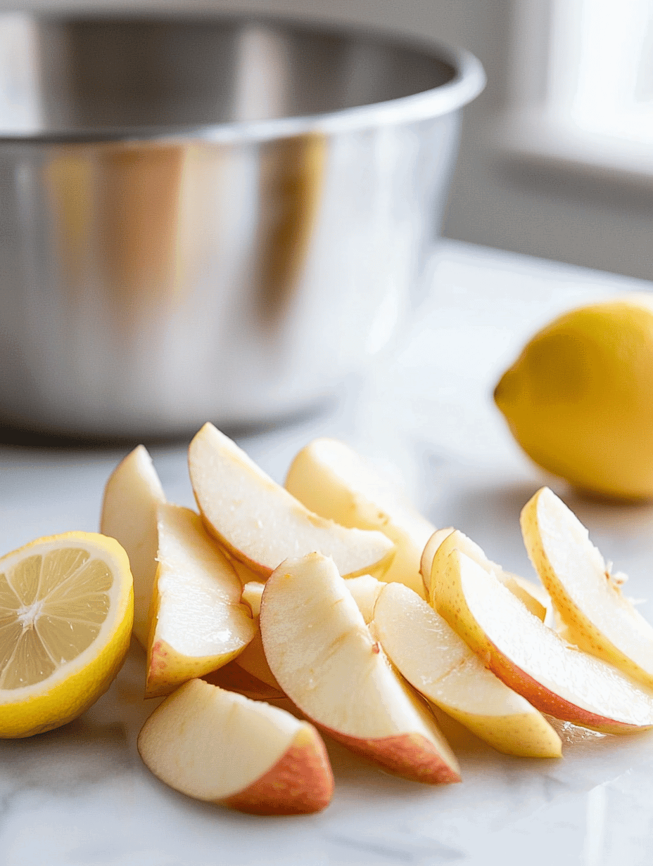 - Peel the apples, then core and slice them into thin wedges. Toss the slices with a little lemon juice to prevent browning, then set aside.2 cups all-purpose flour