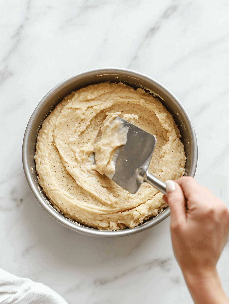 - Pour half of the batter into the prepared cake pan, spreading it evenly with a spatula.