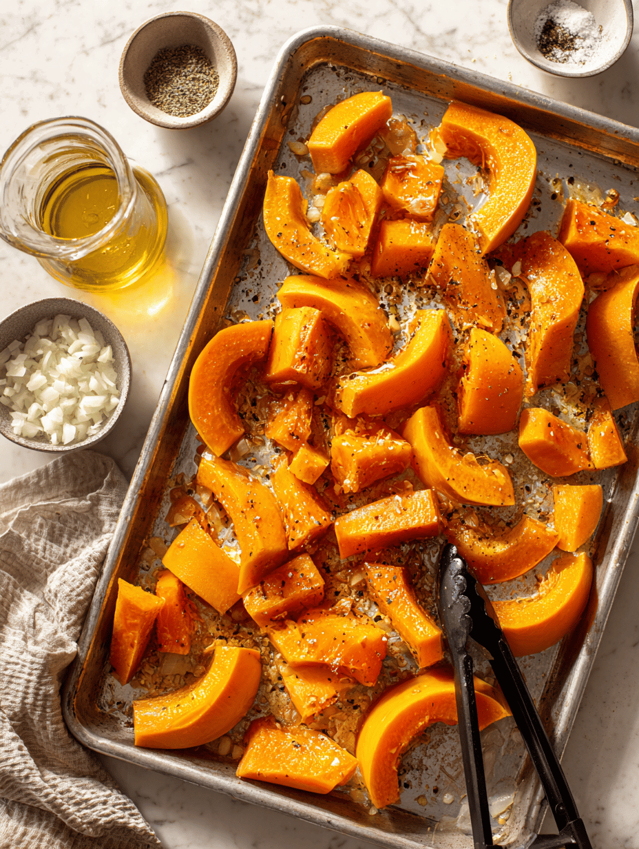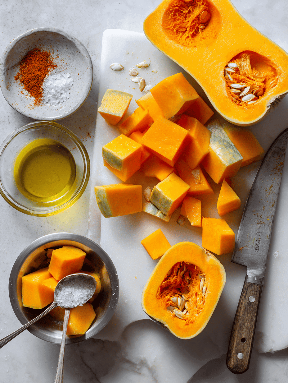 - Preheat your oven to 200°C (400°F). Line the baking sheet with parchment. Peel and seed the squash, then cut into 2-inch cubes. Toss with 2 tbsp olive oil, salt, and pepper.