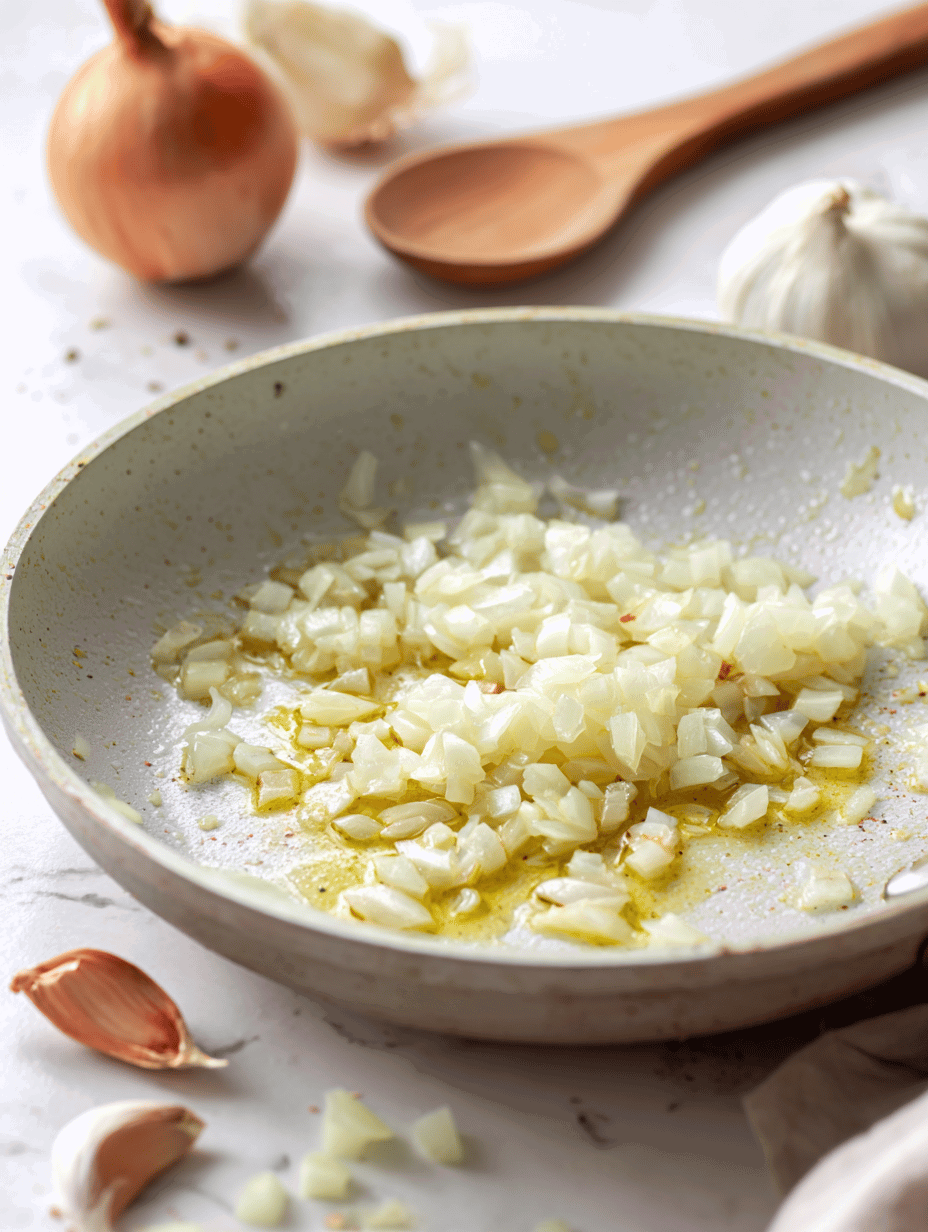 - While the squash roasts, dice the onion and mince the garlic. Heat a tablespoon of oil in a large heavy-bottomed pot over medium heat. Add the onion and sauté for about 5 minutes until it turns translucent and fragrant, filling your kitchen with a warm, sweet aroma.