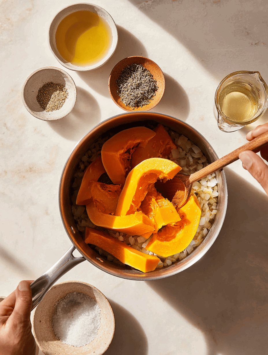 - Once squash is roasted, add it to the pot. Pour in 4 cups vegetable broth. Bring to a gentle simmer. If the mixture looks too thick, add a splash more broth—aim for a velvety consistency.