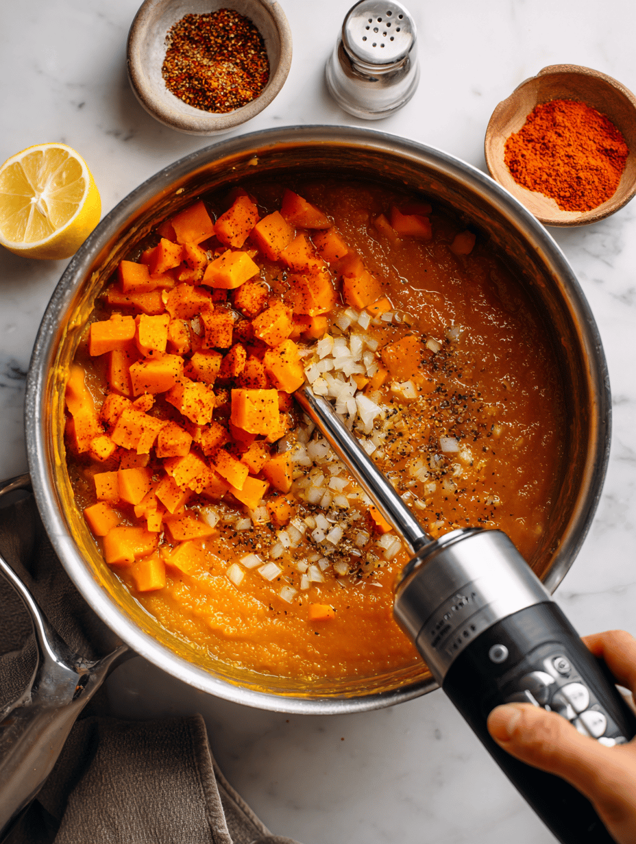- Use an immersion blender directly in the pot, or transfer the mixture to a blender in batches. Puree until the soup is silky smooth, with no lumps remaining. Taste and adjust the seasoning with salt, pepper, and smoked paprika if desired.