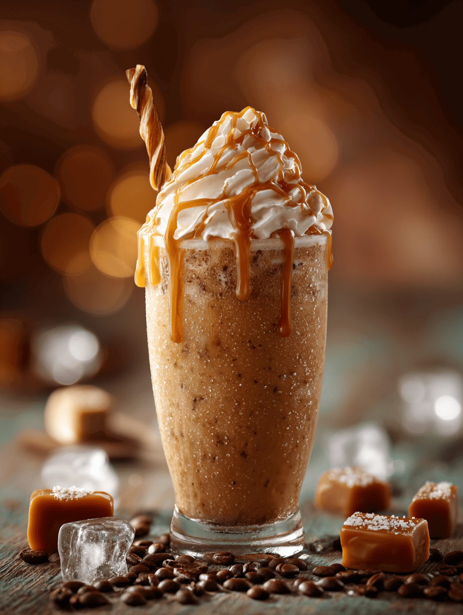 • I get a thrill from how the caramel turns into a glossy, smoky ribbon through the icy blend—like liquid gold.