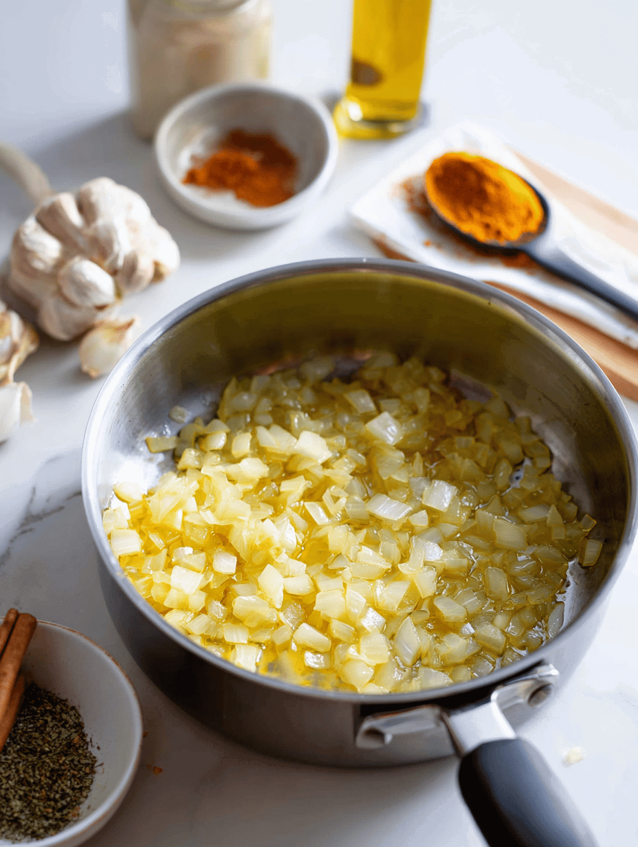 2. While pumpkin roasts, sauté chopped onion and garlic in olive oil over medium heat (about 180°C/350°F) until golden and soft, 8-10 minutes. The kitchen will fill with a mellow, sweet aroma.