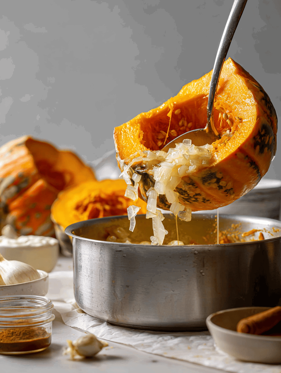 • Remove the roasted pumpkin from the oven and let it cool slightly. Scoop out the flesh and add it to the pot with the sautéed onions and garlic. Stir to combine.