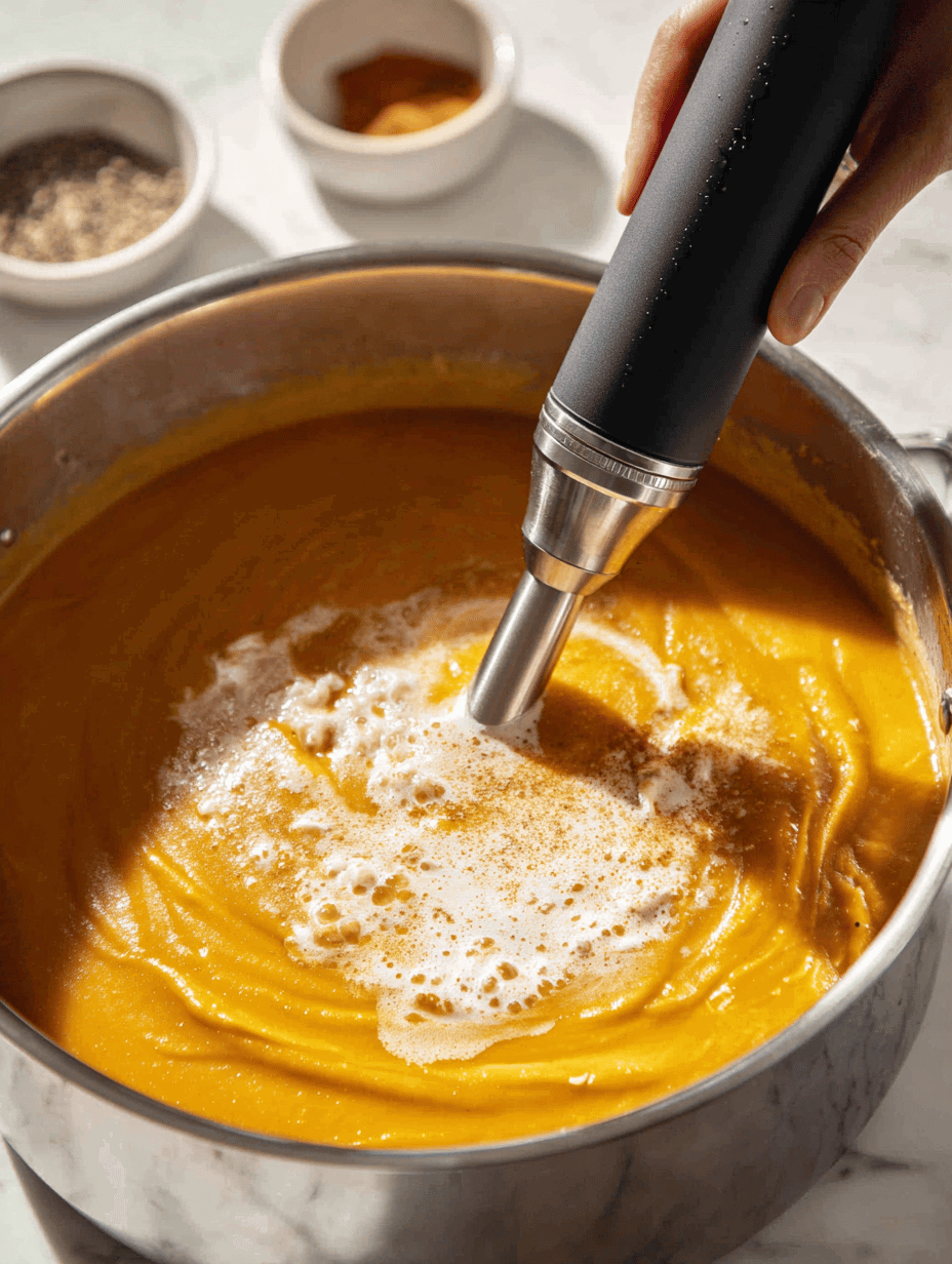 • Use an immersion blender to puree the soup directly in the pot until smooth and velvety. If using a traditional blender, carefully transfer the hot mixture in batches, blending until silky, then return to the pot.