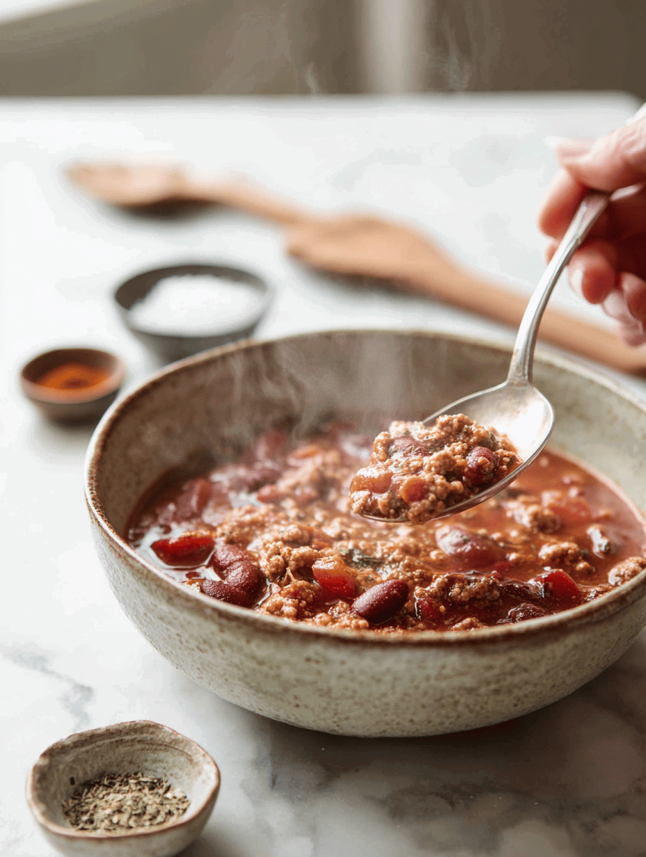 - Taste the chili and adjust seasoning with additional salt, pepper, or spices as needed. If it’s too watery, uncover and simmer until thickened; if too thick, stir in a splash of broth.