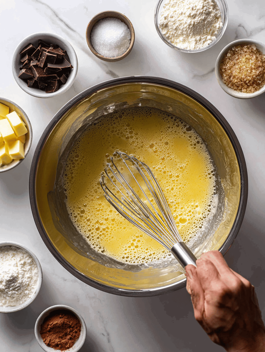 - In a large mixing bowl, whisk the eggs and brown sugar vigorously for about 2 minutes until the mixture is frothy and slightly doubled in volume.