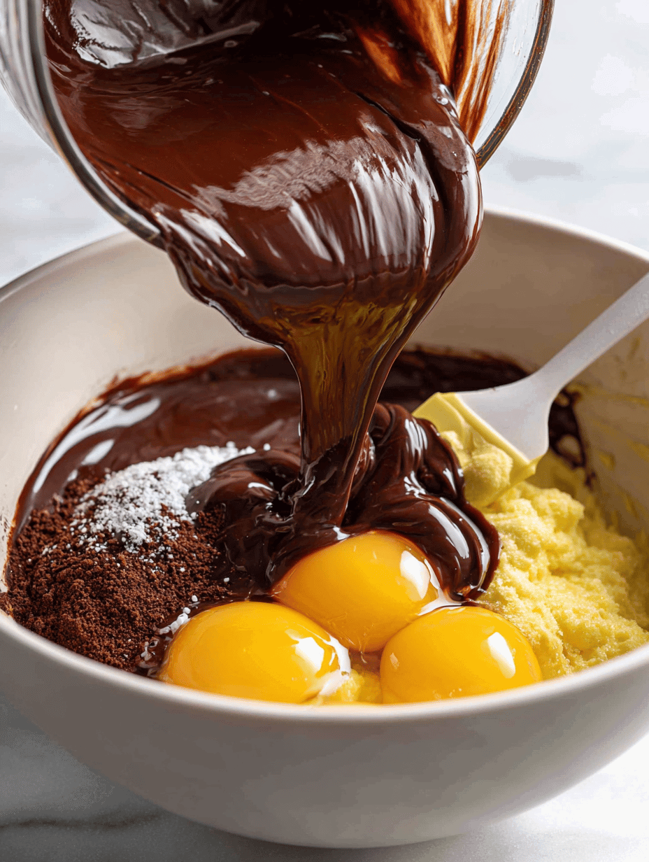- Pour the slightly cooled chocolate mixture into the egg-sugar blend, folding gently with a spatula until well combined and smooth.
