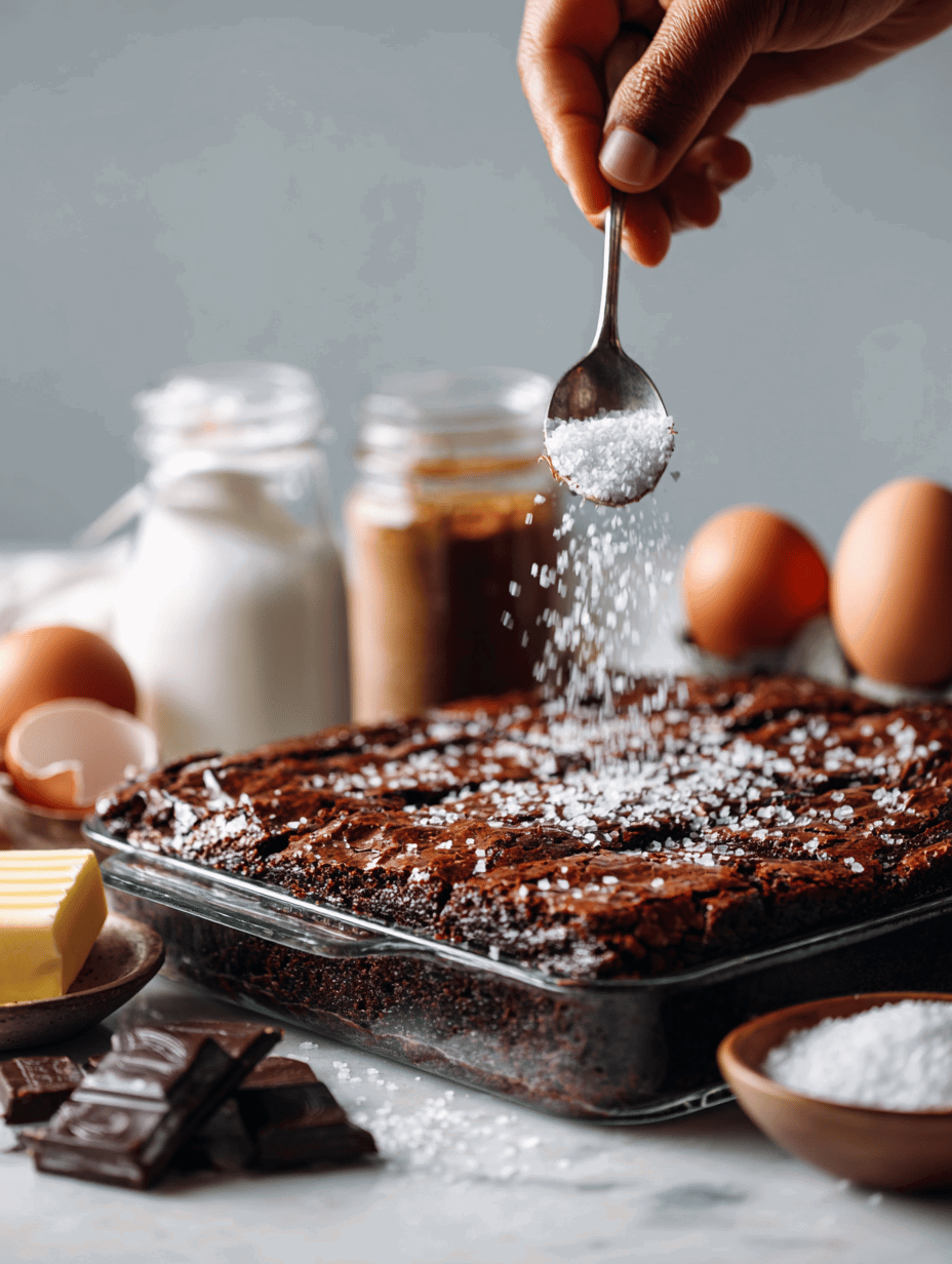 - Remove the brownies from the oven and sprinkle generously with sea salt for that perfect savory contrast. Allow them to rest in the pan for about 15 minutes to set.