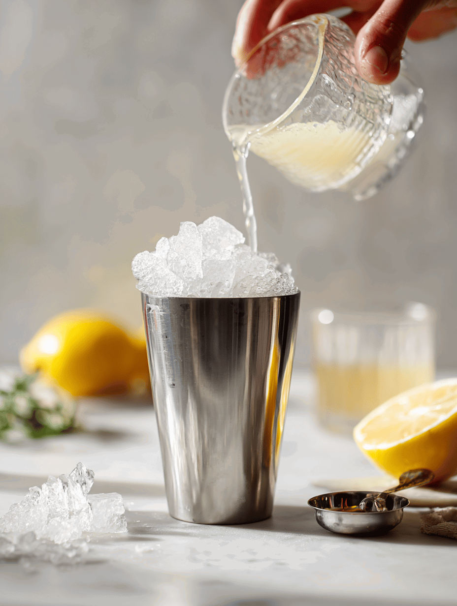- Fill your cocktail shaker halfway with ice, ensuring a good amount of chill.
