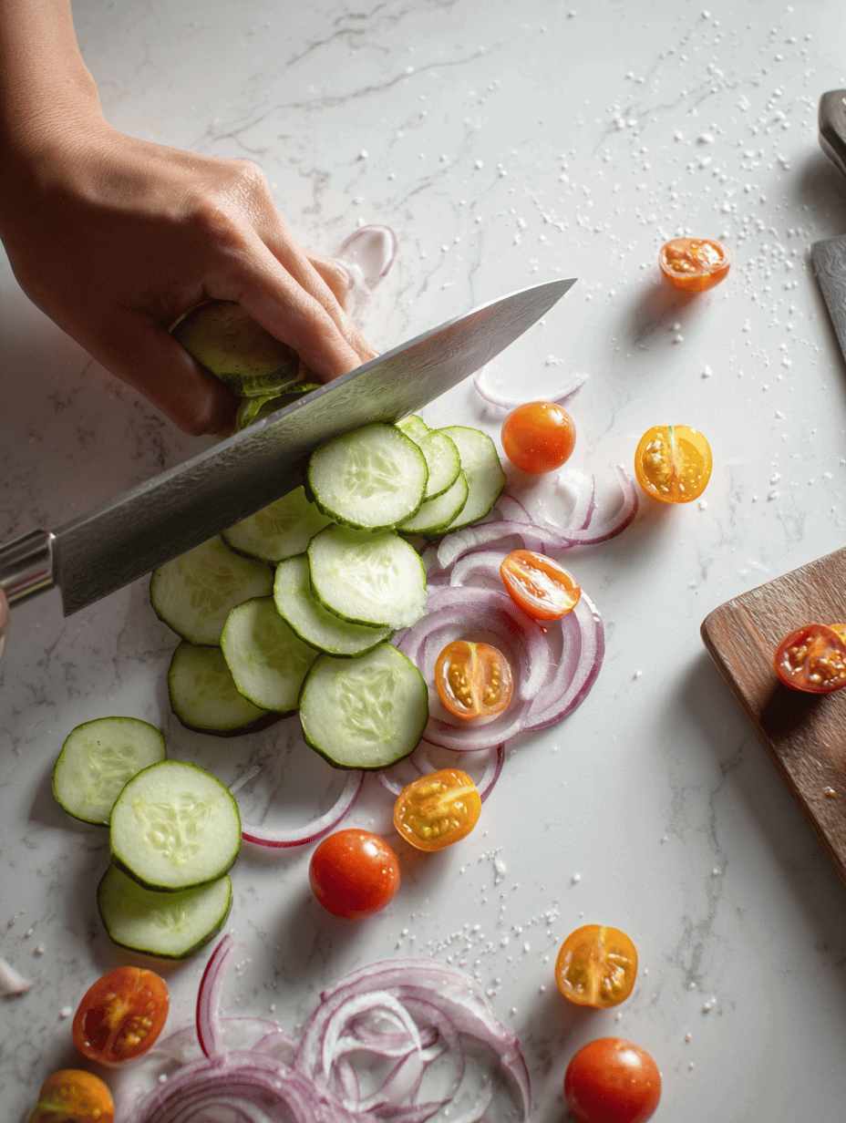 • Slice the cucumber thinly, halve the cherry tomatoes, and thinly slice the red onion. Toss these vegetables together in the large bowl.