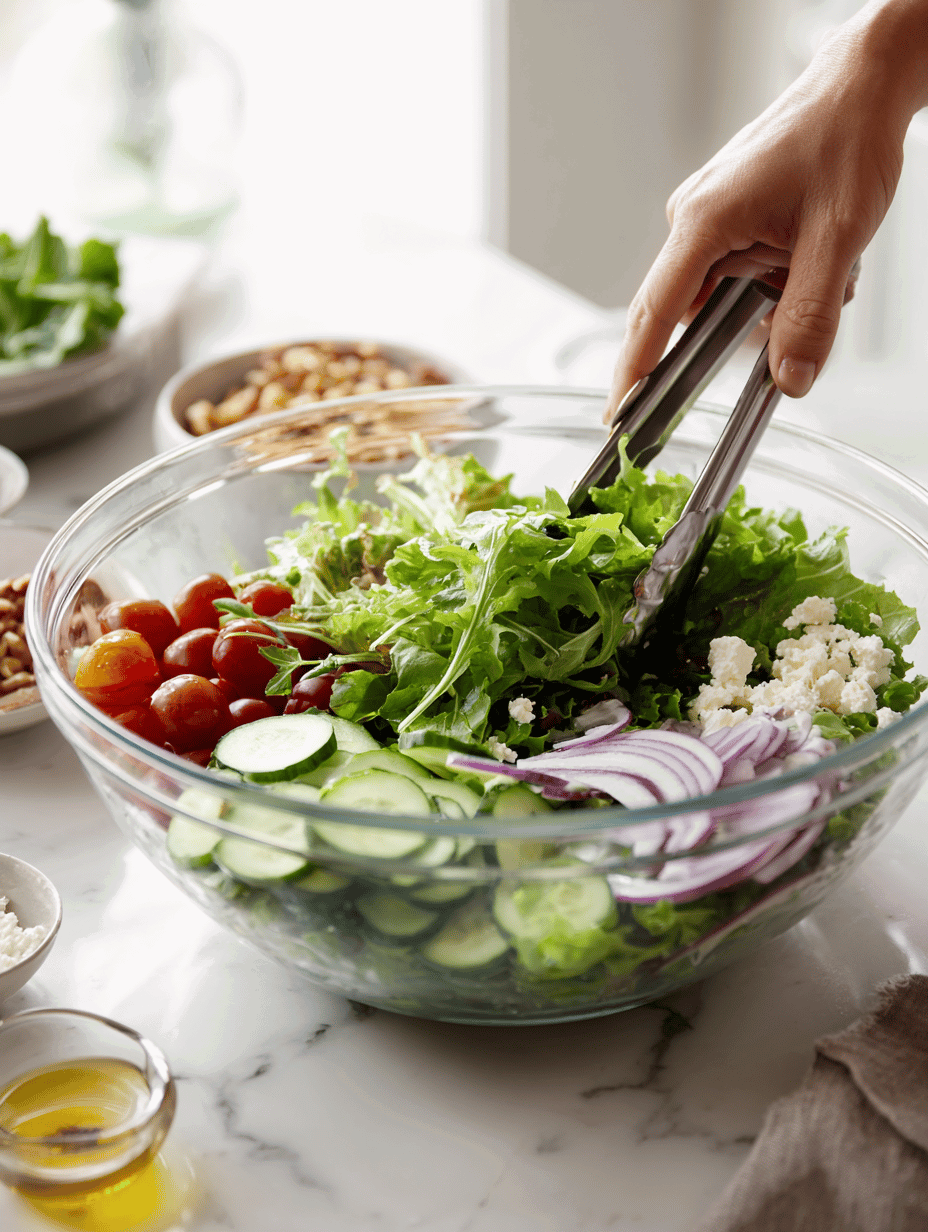 • Give the salad a gentle final toss to distribute the toppings evenly without bruising the greens.