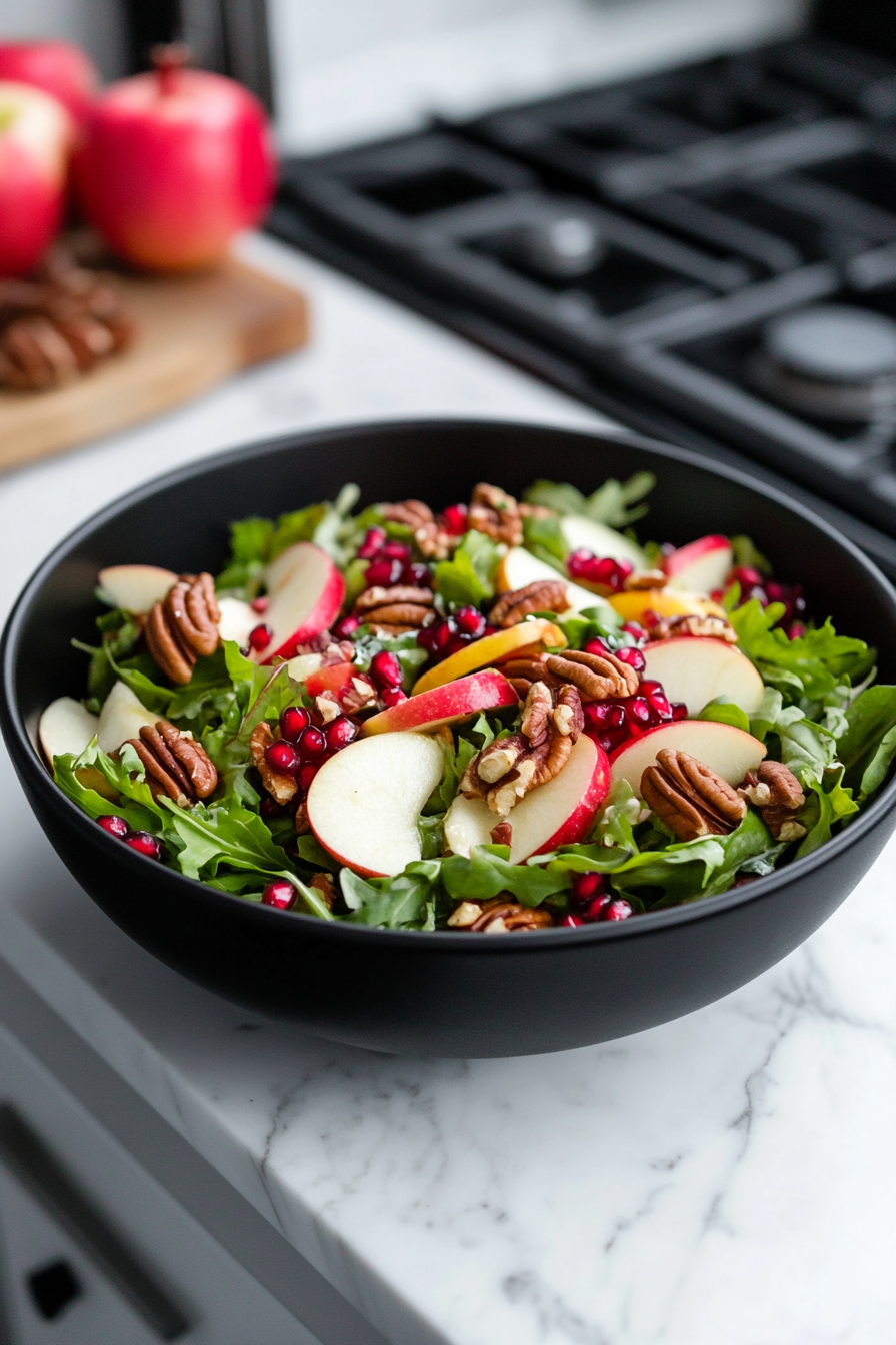 • Top with sliced apples, pomegranate seeds, and pecans.