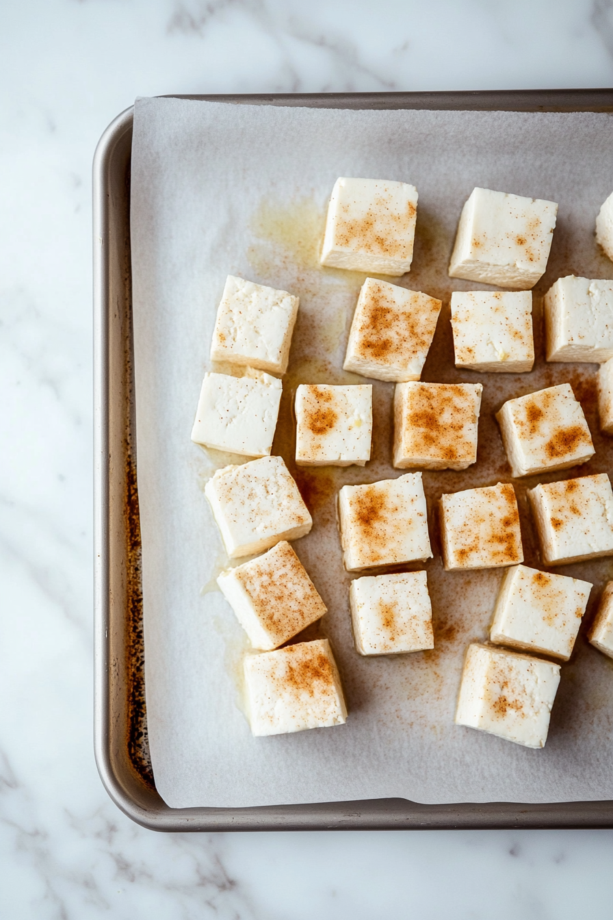 • Coat tofu cubes with cornstarch, remaining cinnamon, and allspice; arrange on a separate parchment-lined baking sheet.