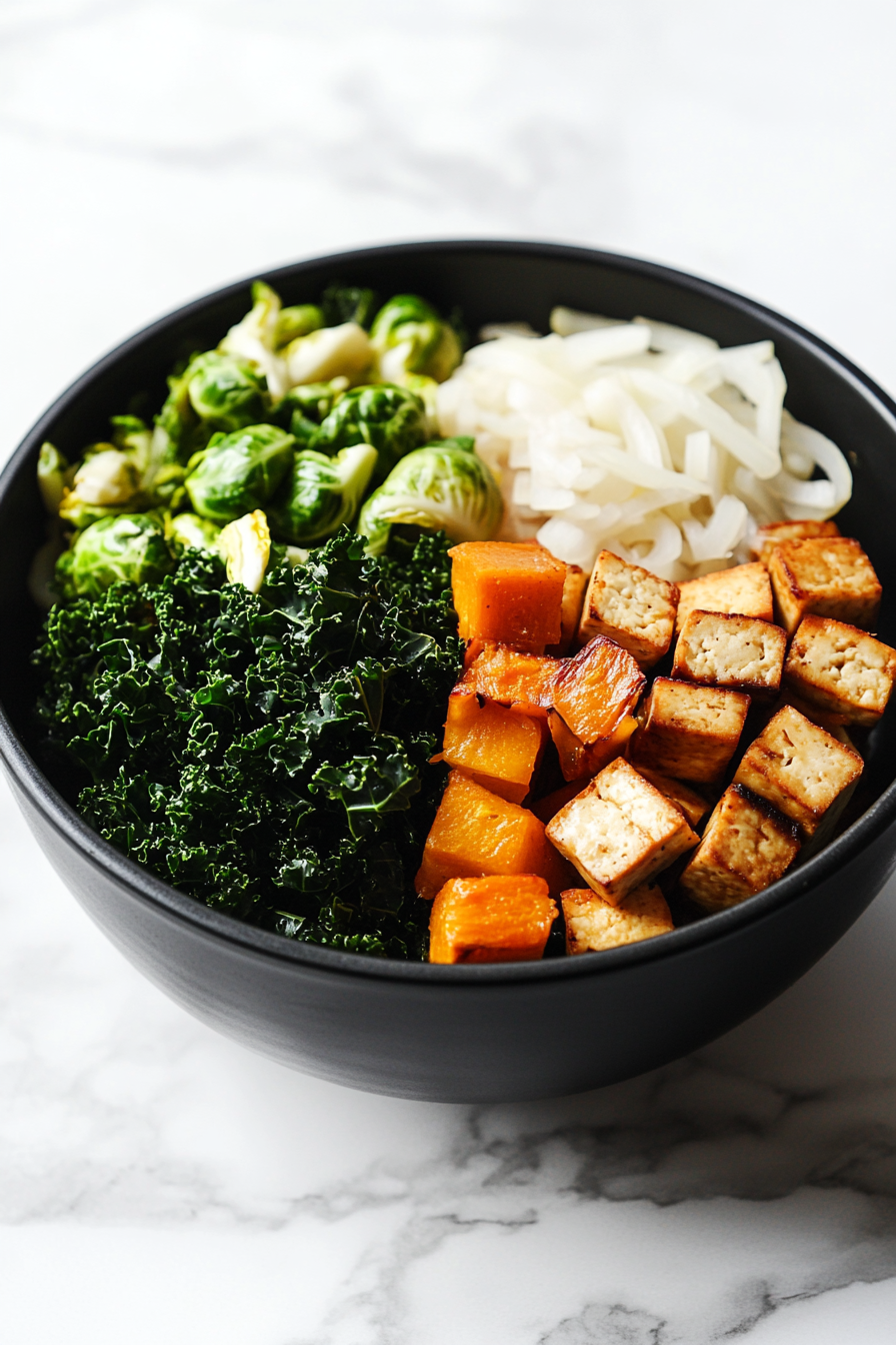 • Layer roasted squash, onions, and tofu over the kale and Brussels.