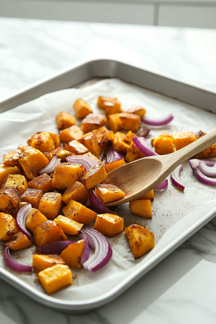 • Toss butternut squash and onions with 2 tablespoons olive oil, ½ tablespoon cinnamon, and ¾ teaspoon allspice; spread on a parchment-lined baking sheet.