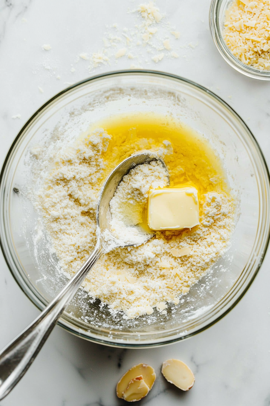- In a bowl, mix butter, parmesan, and almond flour, then sprinkle over the casserole.