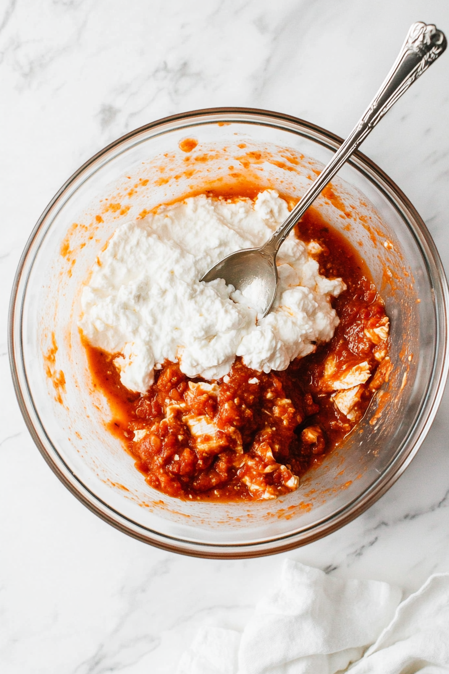 - In a large bowl, mix the chicken, 1 cup marinara, and ricotta cheese.