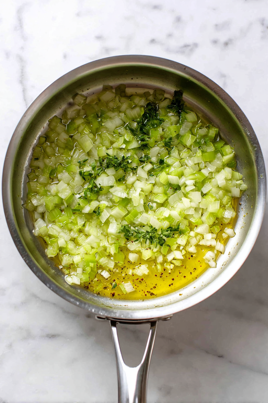 • Add the finely chopped onion, celery, and minced garlic; cook until tender.