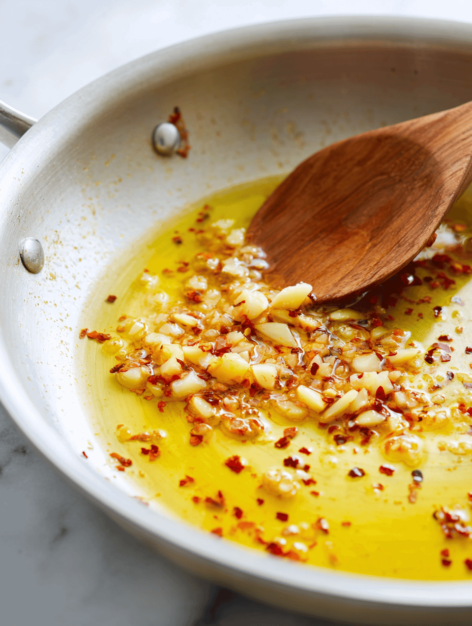 - Add a splash of olive oil, then garlic and red pepper flakes. Cook until fragrant—about 30 seconds—smelling like a spicy garlic cloud.
