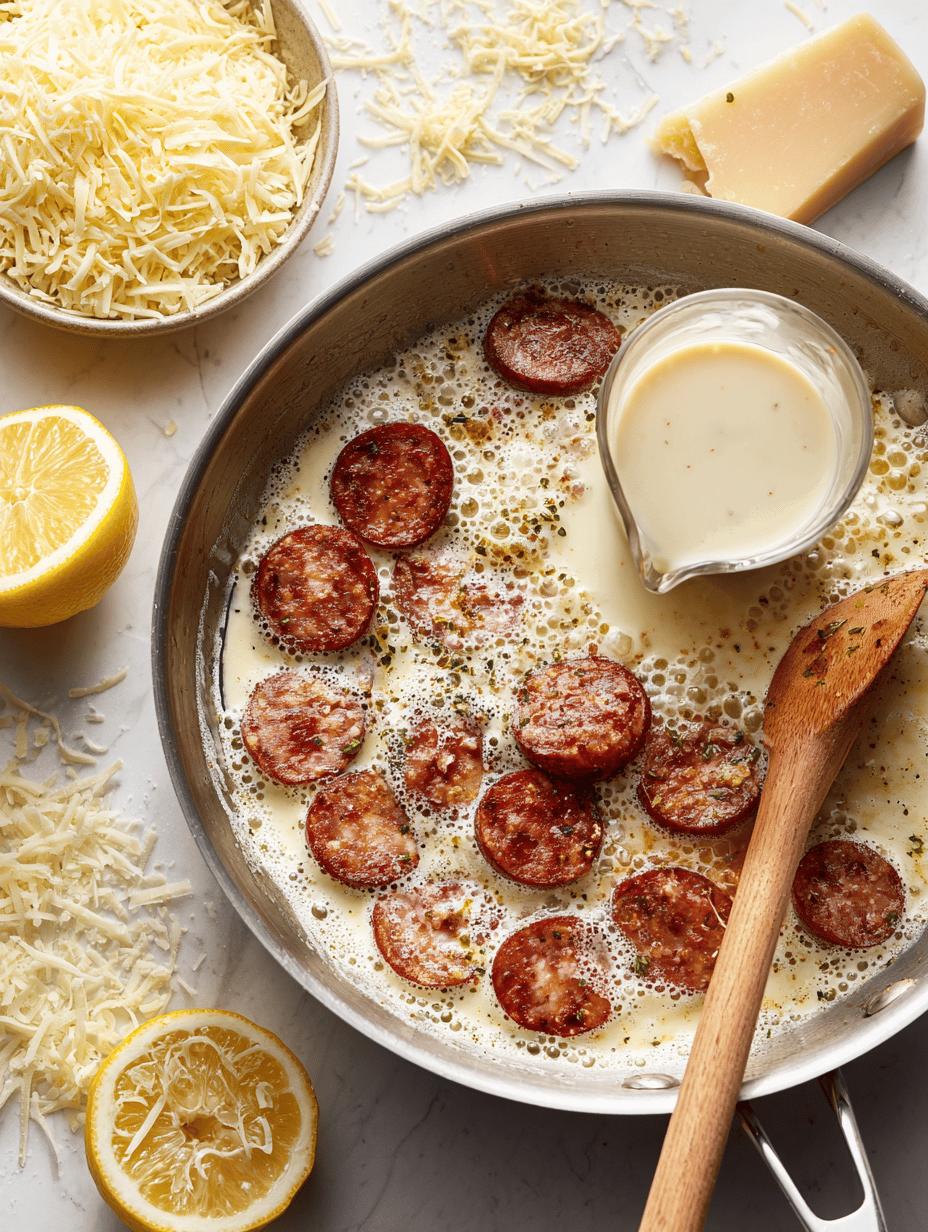 - While pasta cooks, heat the sauté pan over medium-high (around 180°C / 356°F). Add sliced sausage or pepperoni and cook until crispy, about 4-5 minutes. The edges should brown, a little crackle in the fat.