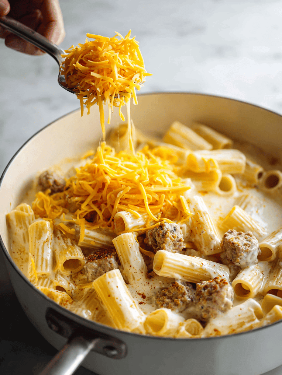 - Sprinkle shredded cheddar cheese over the pasta and stir until melted and gooey, creating a velvety, cheesy coating. If the sauce seems too thick, loosen it with a splash of the reserved pasta water.