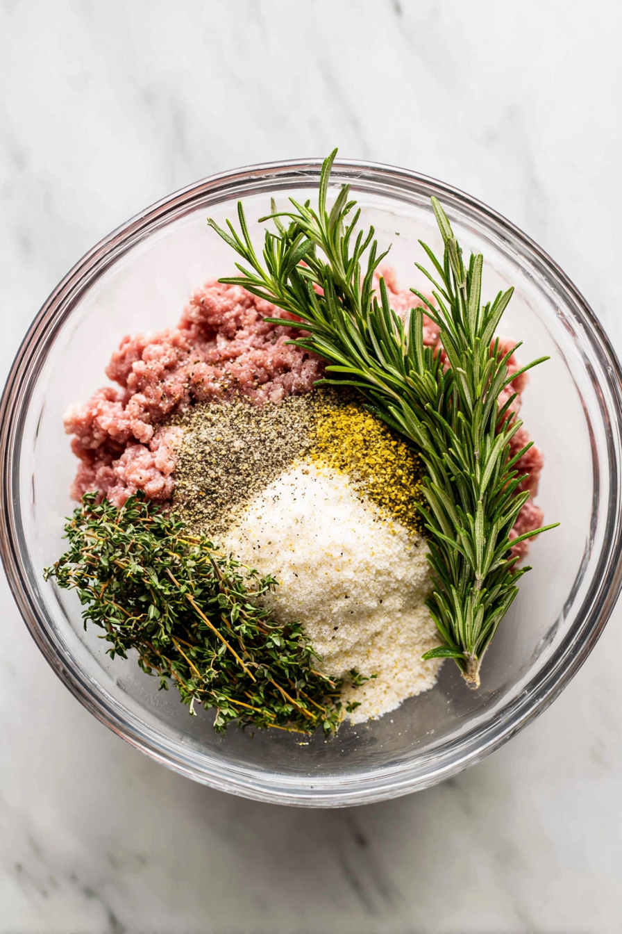 • In a bowl, combine ground lamb, garlic powder, rosemary, thyme, salt, and pepper.