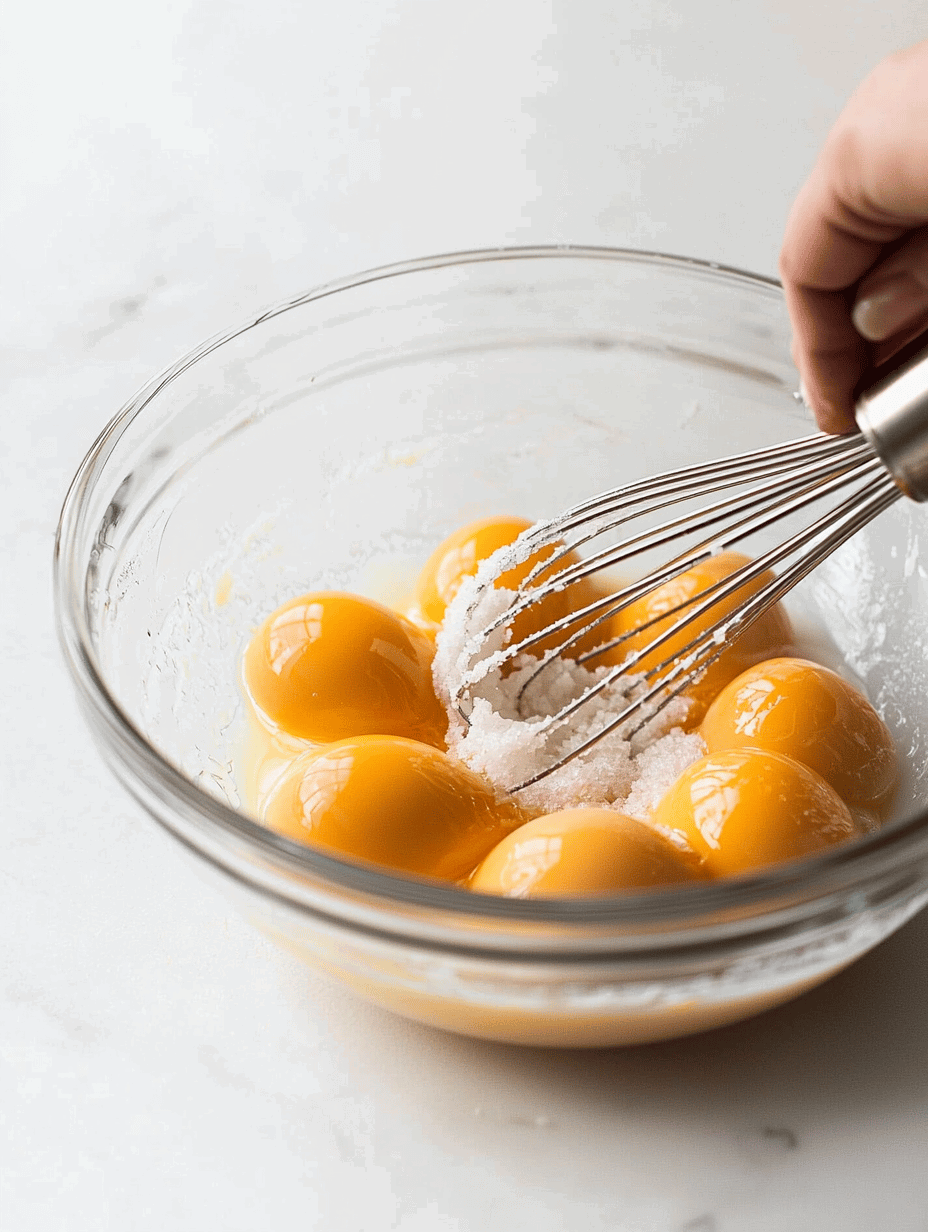 - In a mixing bowl, whisk together the eggs and sugar until the mixture turns slightly pale and becomes smooth.
