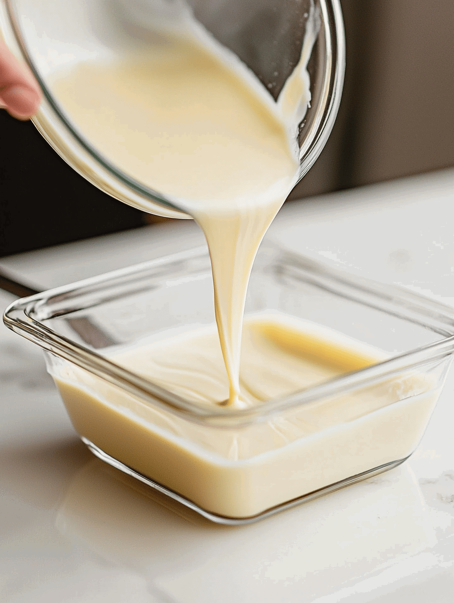 - Pour the mixture into your prepared baking dish, spreading it evenly to fill the base.