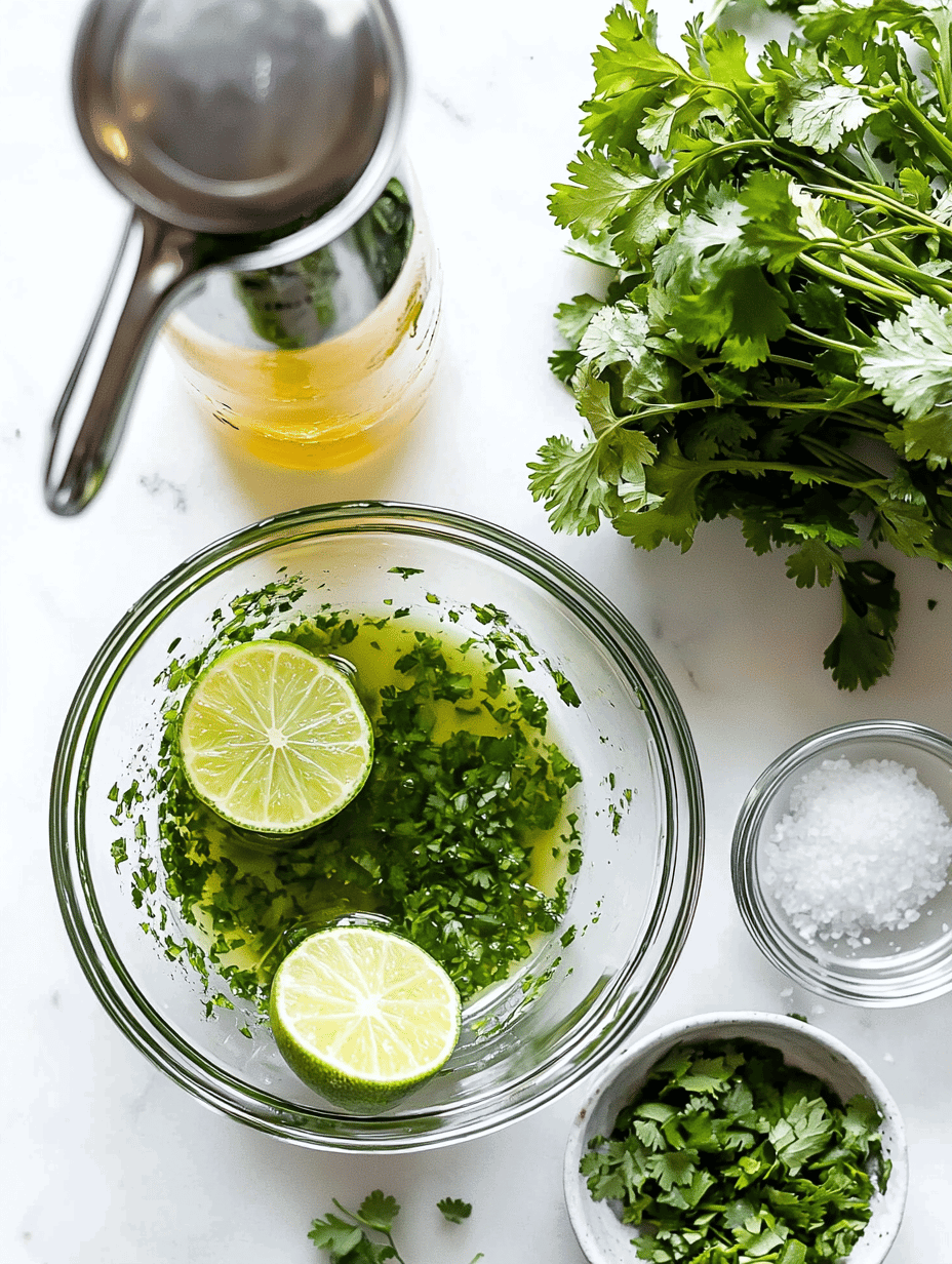 - Slice one lime in half and juice all three limes into a large bowl, then add the minced garlic, chopped cilantro (set aside some for garnish), olive oil, salt, and pepper. Whisk together until well combined to create a vibrant marinade base.