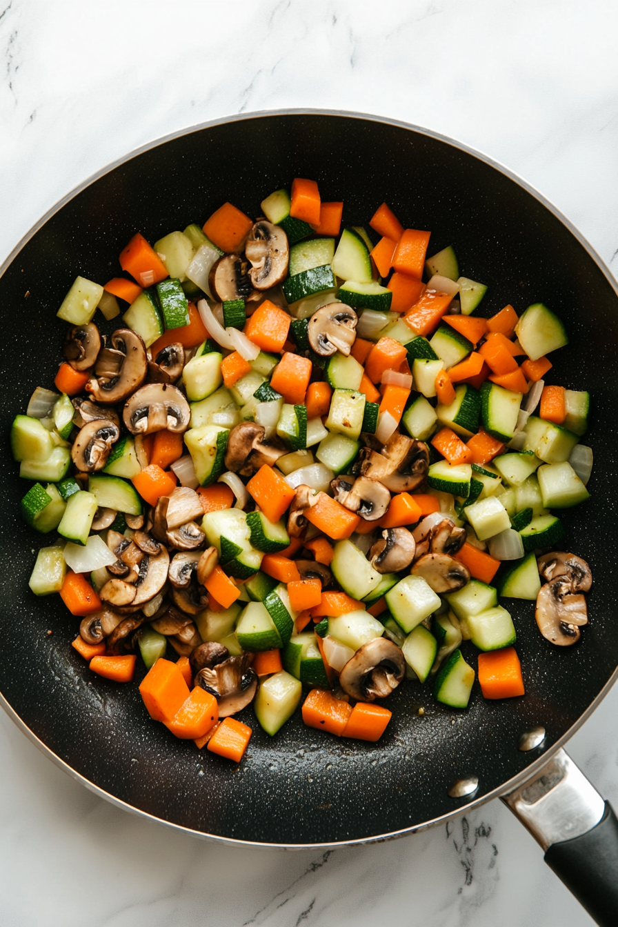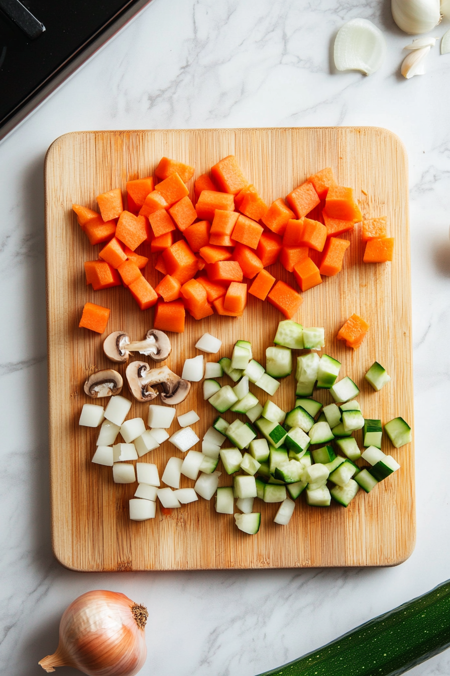 - Dice onion, carrots, green bell pepper, zucchini, and mushrooms evenly.