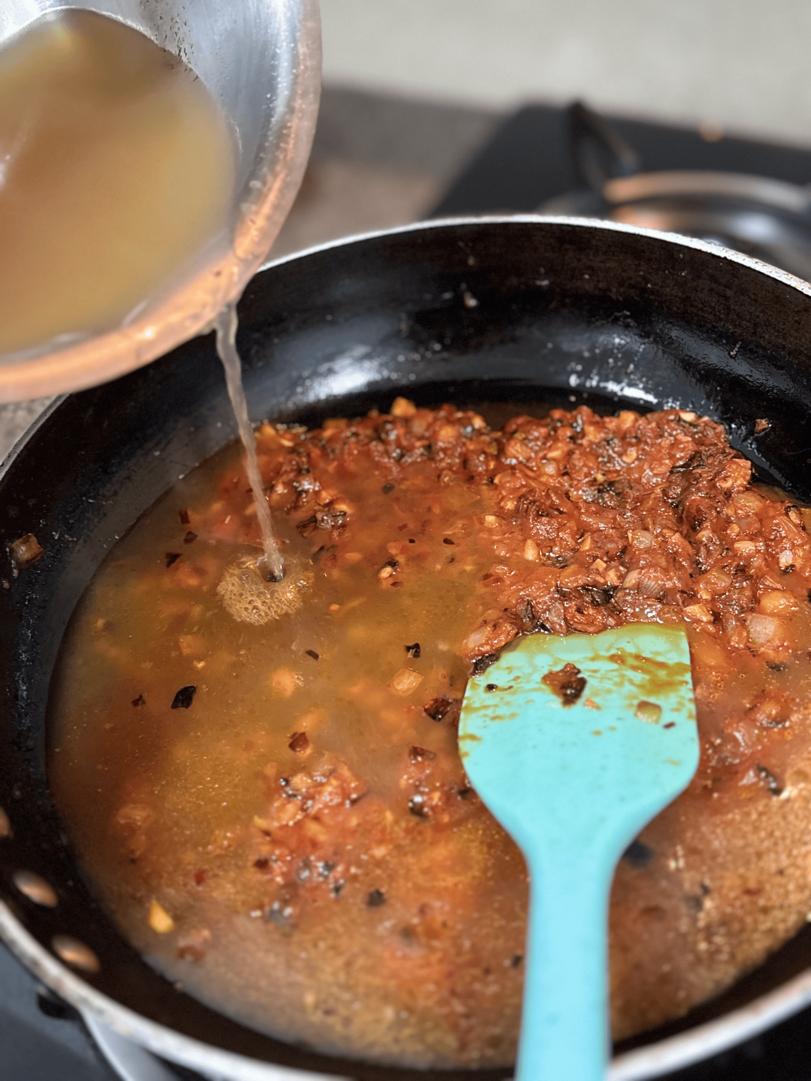 - Add chicken broth, sun-dried tomatoes, oregano, basil, chili flakes, salt, and pepper. Bring to a gentle simmer.
