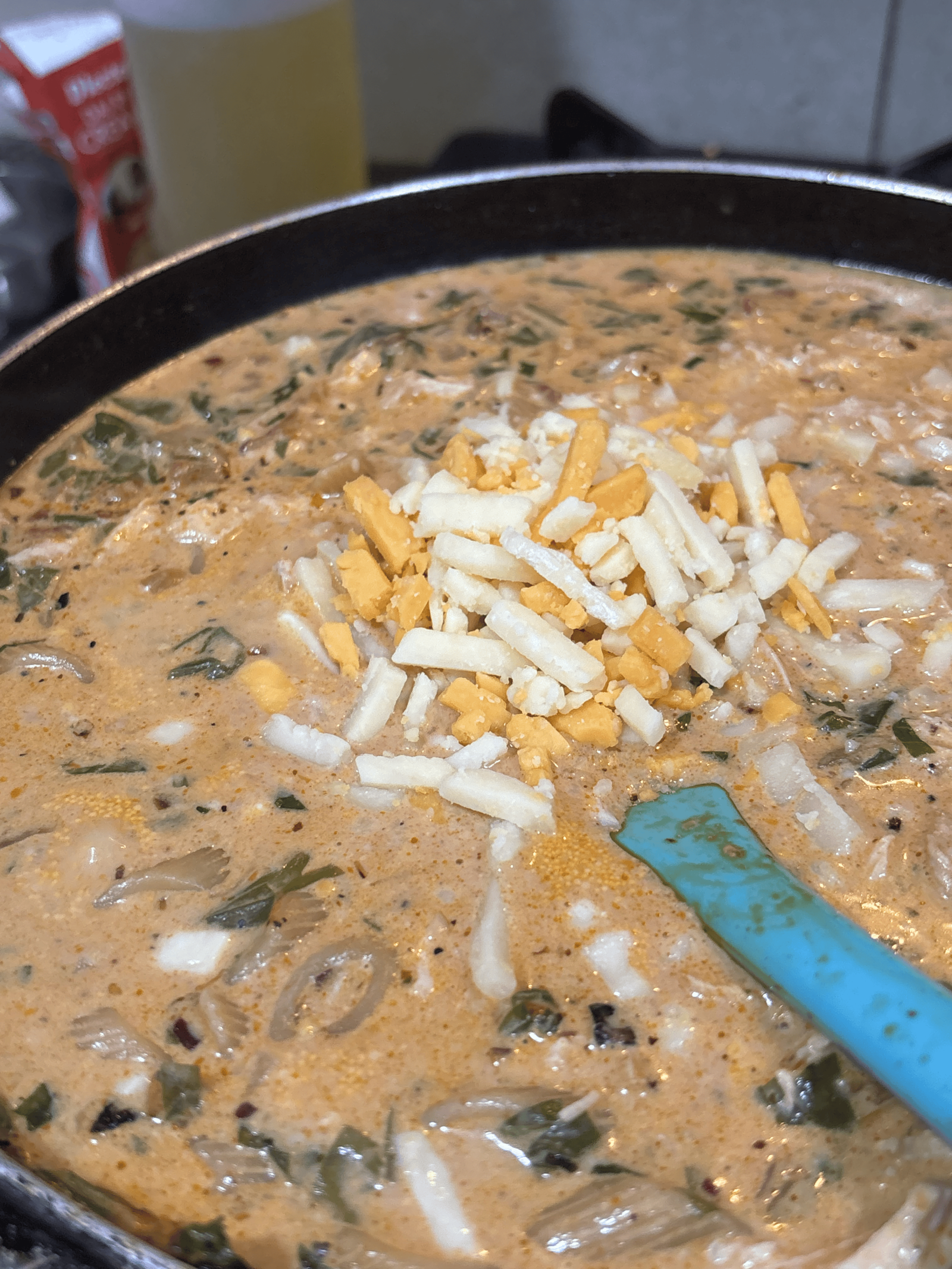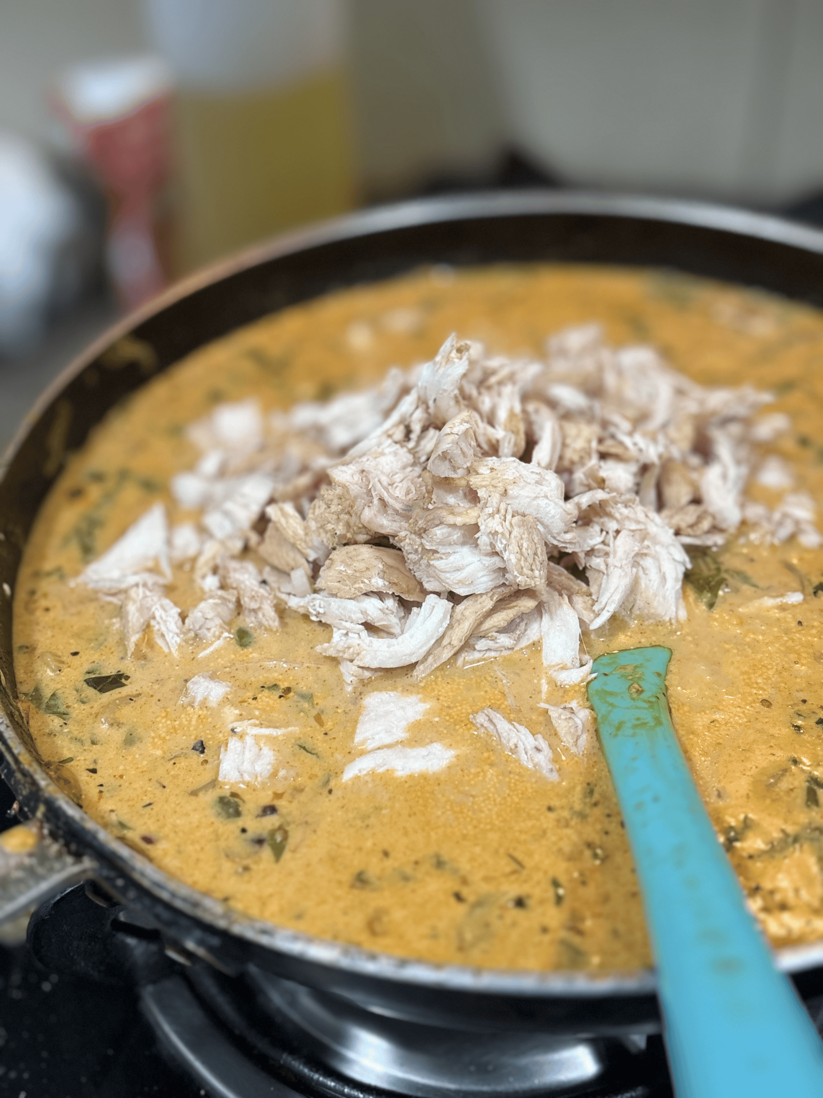 - Stir in the shredded chicken and simmer for 5 minutes.