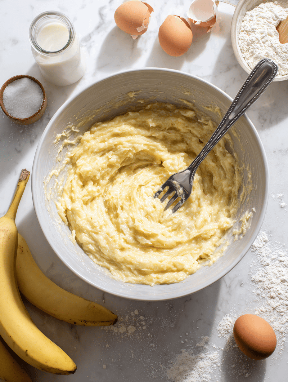 Step 2: In a large bowl, mash ripe bananas until smooth. Add eggs, vanilla, and a splash of milk. Mix until combined.