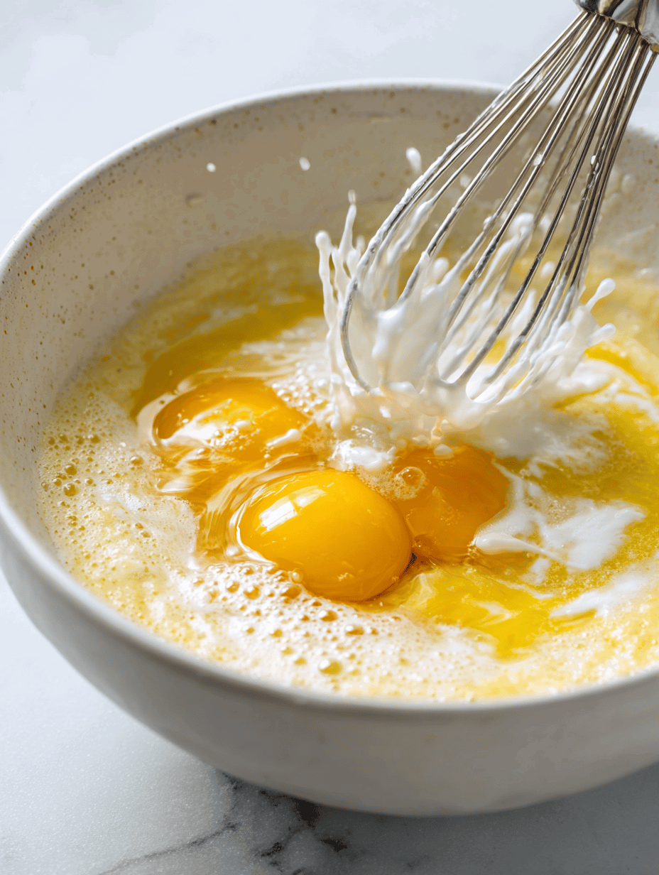 • Add the eggs, vanilla extract, and milk to the mashed bananas, then whisk everything together until the mixture is well combined and slightly frothy.