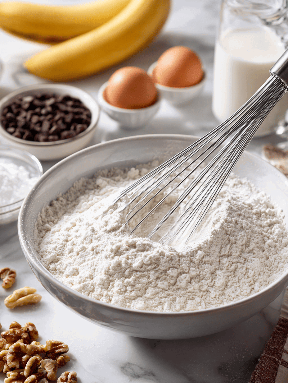 Step 3: In another bowl, whisk together flour, baking powder, baking soda, a pinch of salt, and a handful of chopped nuts or chocolate chips.