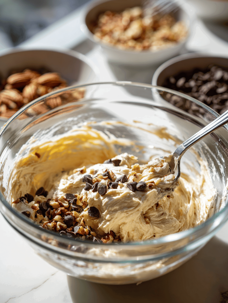 • Stir in the chocolate chips and toasted nuts, distributing them evenly throughout the batter for bursts of flavor and crunch.