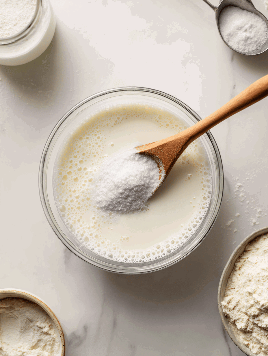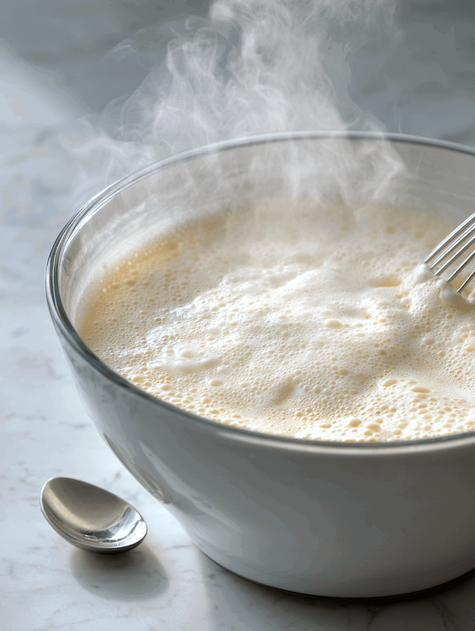 - Add a teaspoon of sugar and the yeast to the warm milk, gently stir, and let sit until frothy, about 5-8 minutes. You’ll see bubbles and a foamy top indicating activation.