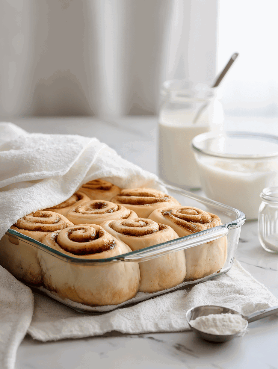 - Cover the baking dish with a clean towel and let the rolls rise again until they puff up, about 30-45 minutes.