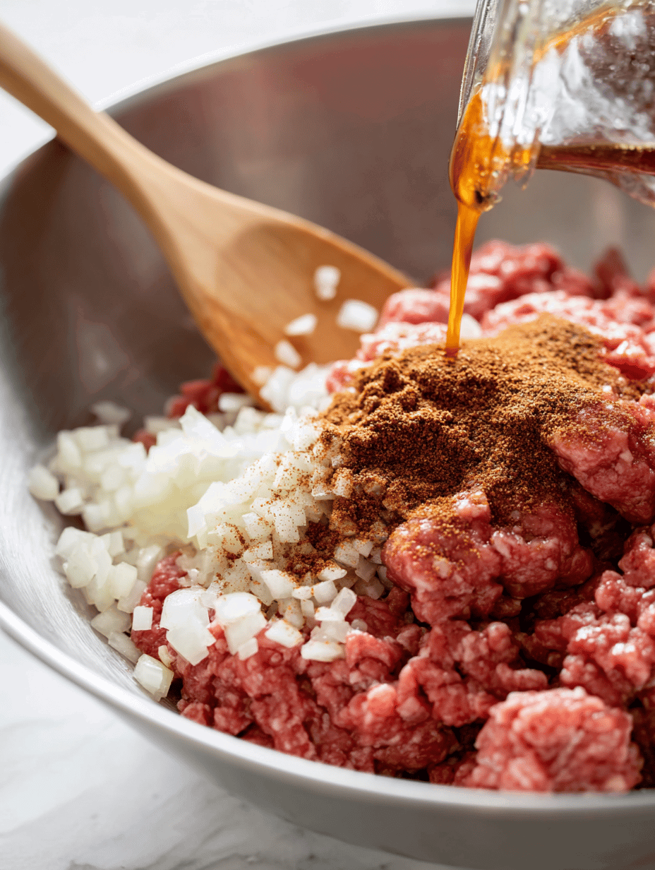 Step 2: Mix ground beef with chopped onions, garlic, a pinch of cinnamon, and a splash of Worcestershire sauce.