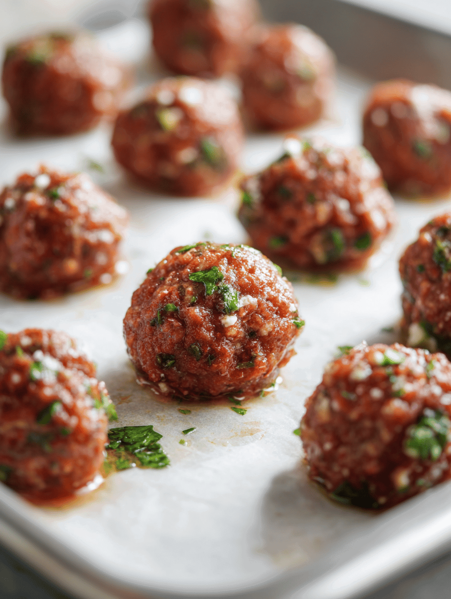- Place the shaped meatballs on the prepared baking sheet, spacing them out evenly.