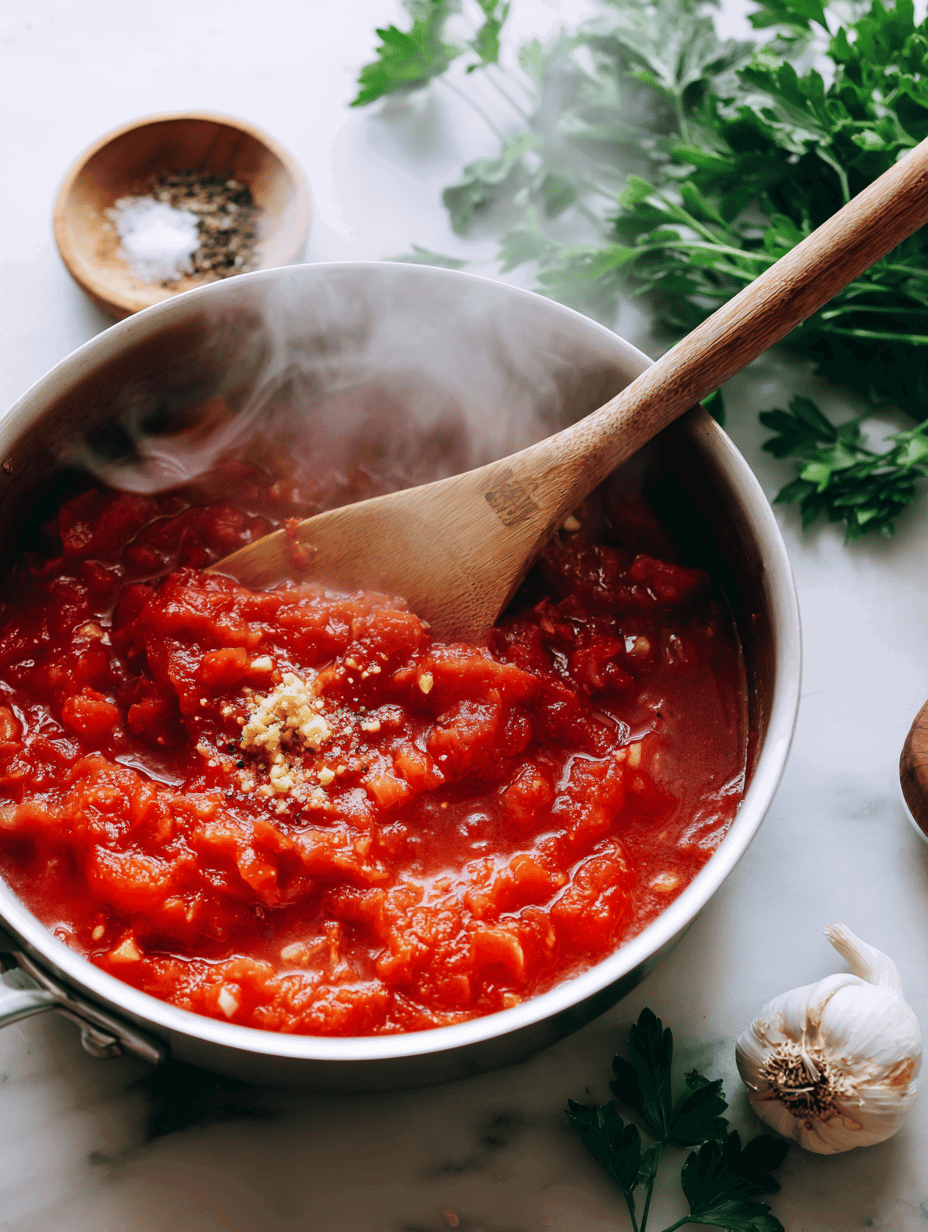 Step 5: While they bake, prepare a quick tomato sauce with crushed tomatoes, garlic, and a pinch of sugar.