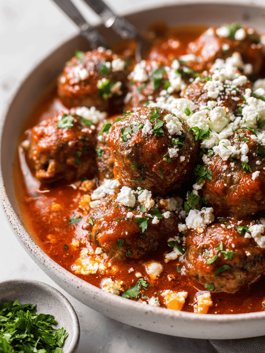 - Serve the warm meatballs draped with the tomato sauce, garnished with chopped parsley and crumbled feta or cheese if desired.
