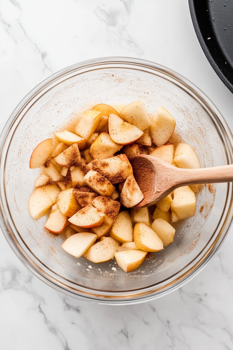 - Mix sugars, flour, salt, spices, melted butter, and vanilla in a bowl. Toss with apple slices until evenly coated.