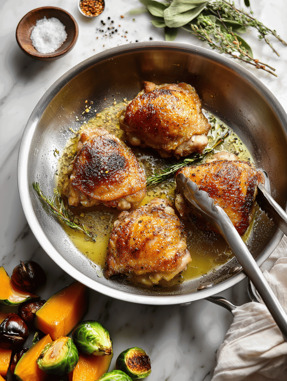 • Bone-in chicken thighs: Juicy, with rich flavor from the bone, plus crispy skin if seared properly.
